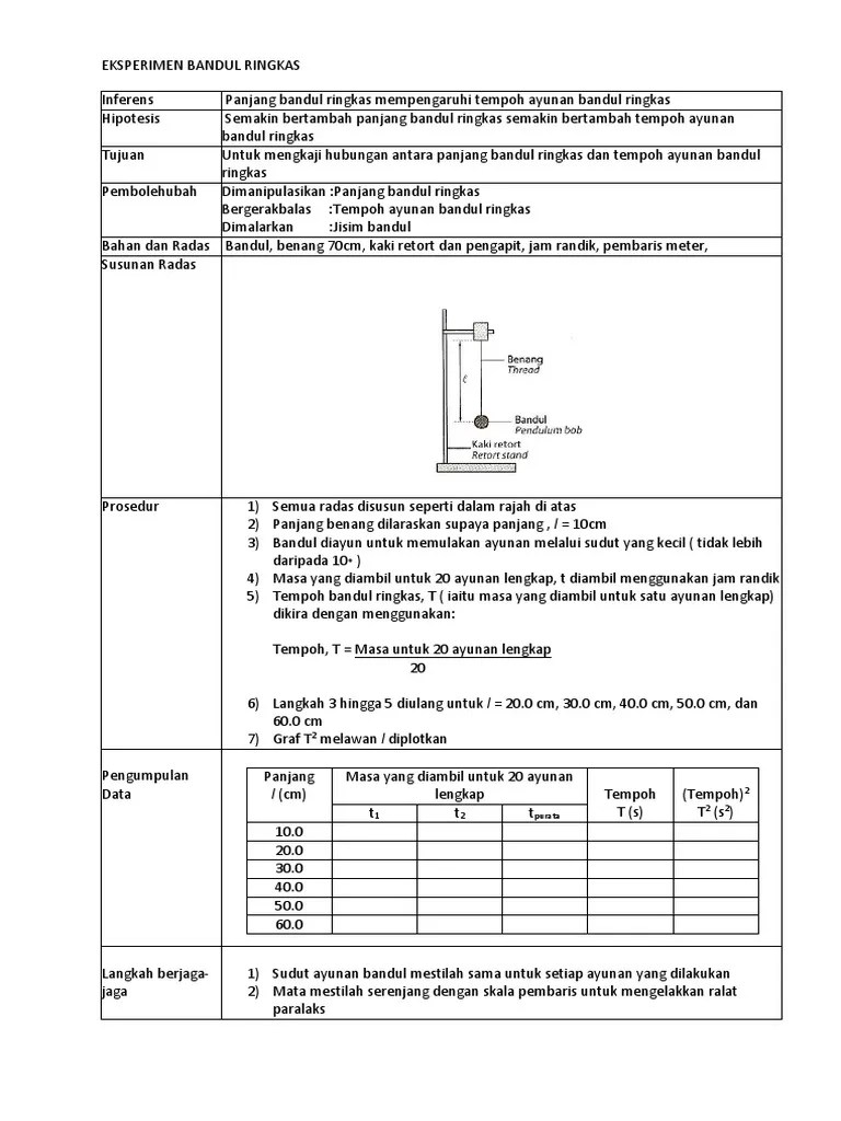 Eksperimen 1.1 (muka surat 36) tajuk pernyataan masalah hipotesis tujuan pembolehubah bahan dan radas prosedur ayunan bandul bagaimanakah . Masa yang diambil untuk 10 ayunan lengkap direkodkan. You can do the exercises online or download the worksheet as pdf. Bandul dan tempoh ayunan bandul. Ayunan bandul | eksperimen fizik tingkatan 4 kssm. Eksperimen ayunan bandul penskoran bil mengkaji hubungan antara panjang perkara bandul dan tempoh ayunan bandul Eksperimen diulang dengan panjang bandul berlainan.